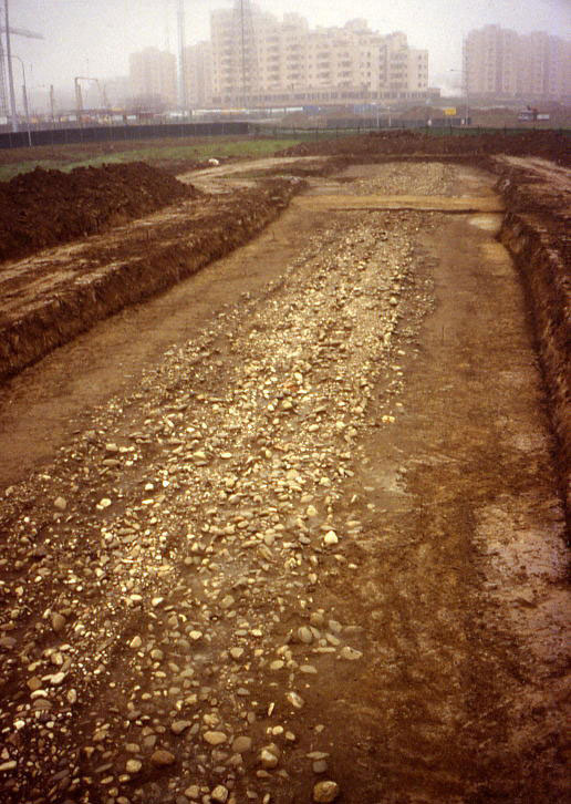 Lungo tratto di strada romana “glareata” (costituita cioè da una massicciata in ghiaia e ciottoli) dopo la ripulitura. Sullo sfondo i palazzi del quartiere Meridiana